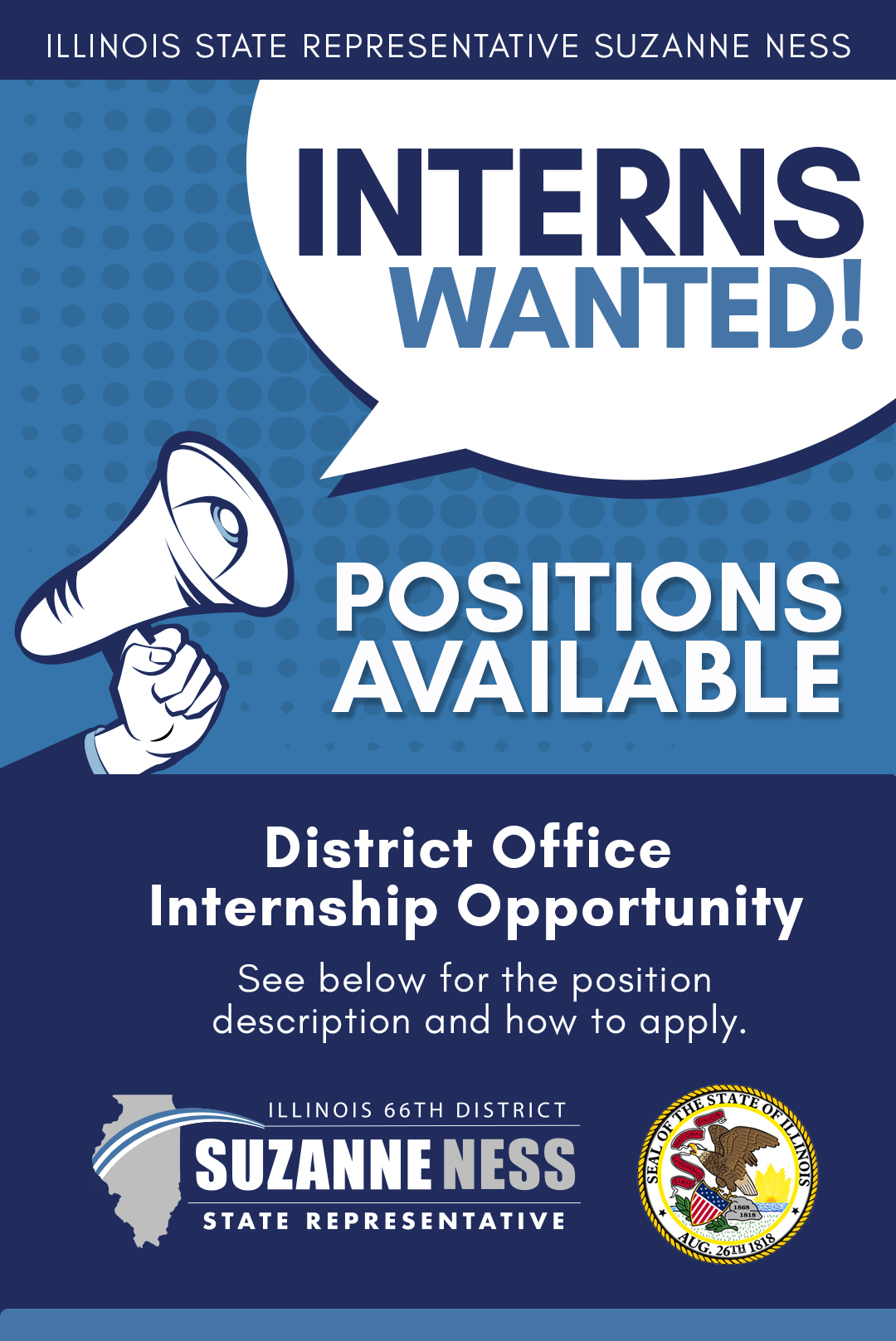 Illinois State Representative Suzanne Ness is seeking community-oriented, responsible, and hard-working interns for her District Office located in Carpentersville, IL. The District Interns should be able to effectively communicate and collaborate with a small team, be comfortable speaking over the phone and attending events, and be passionate about public service. Candidates with ties to District 66 are preferred, but not required.