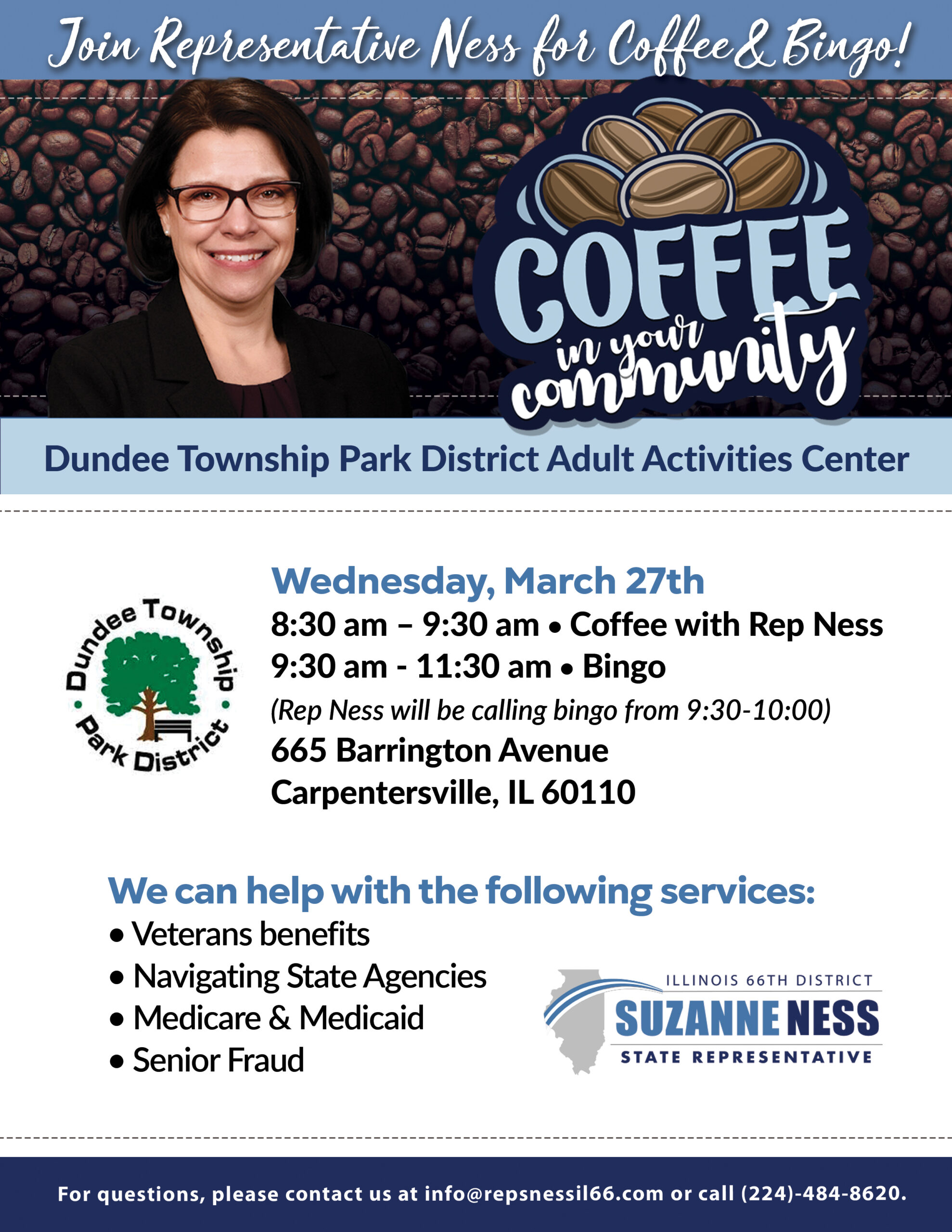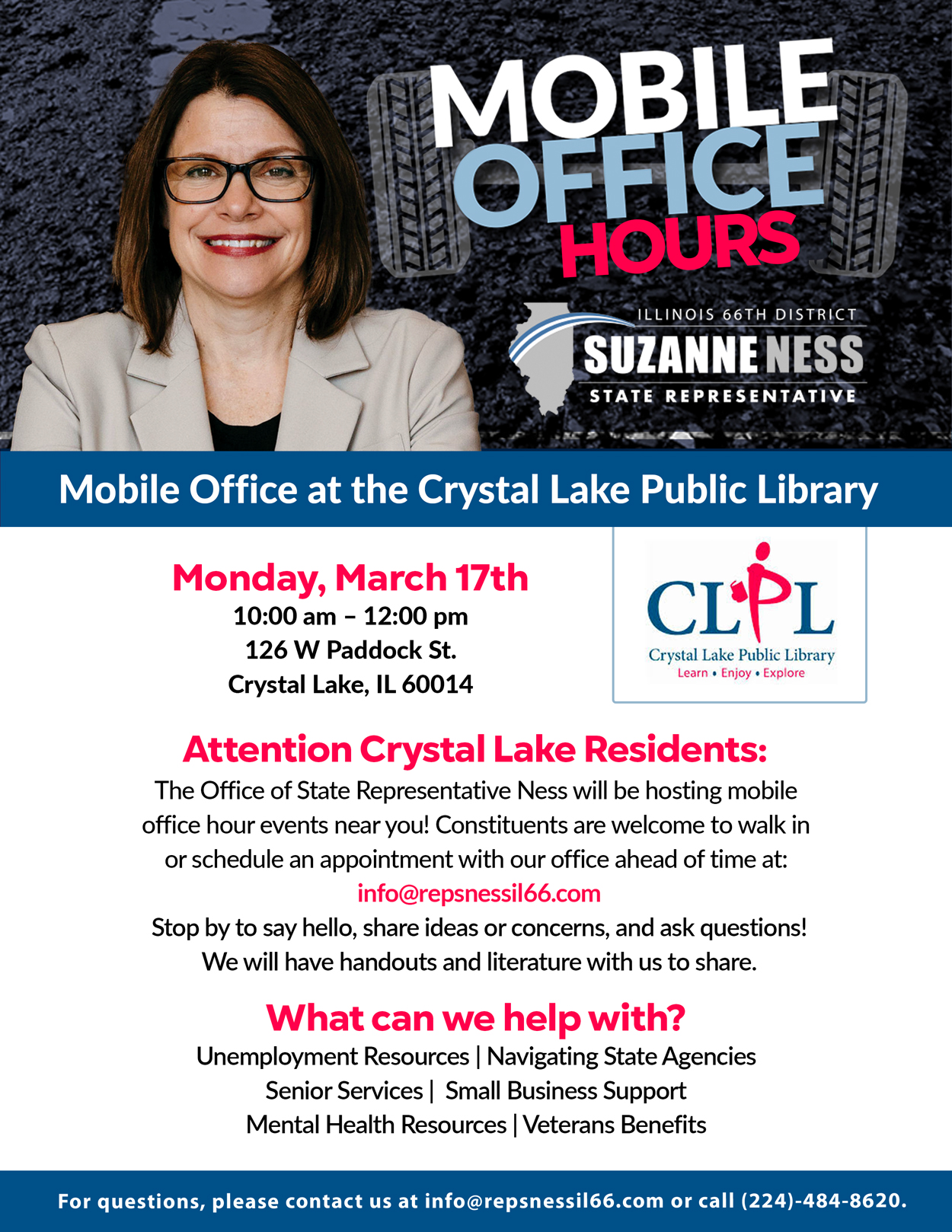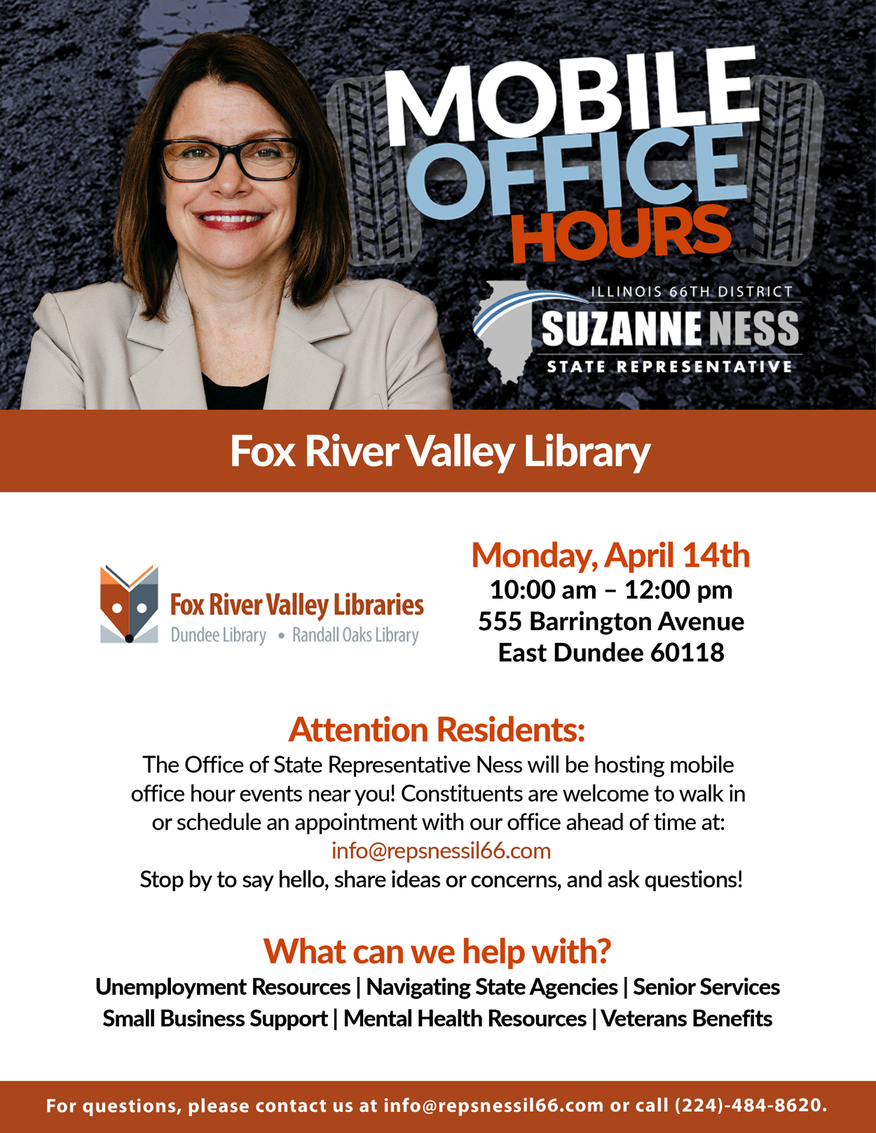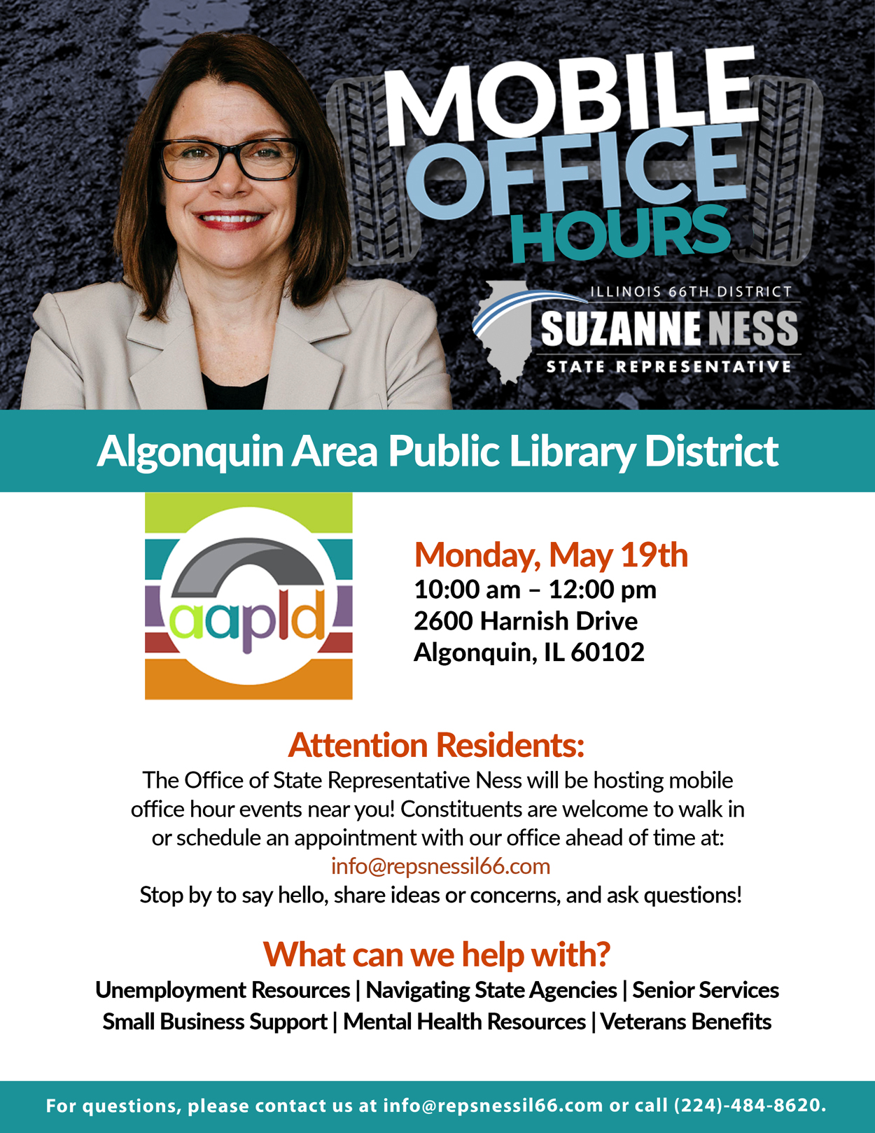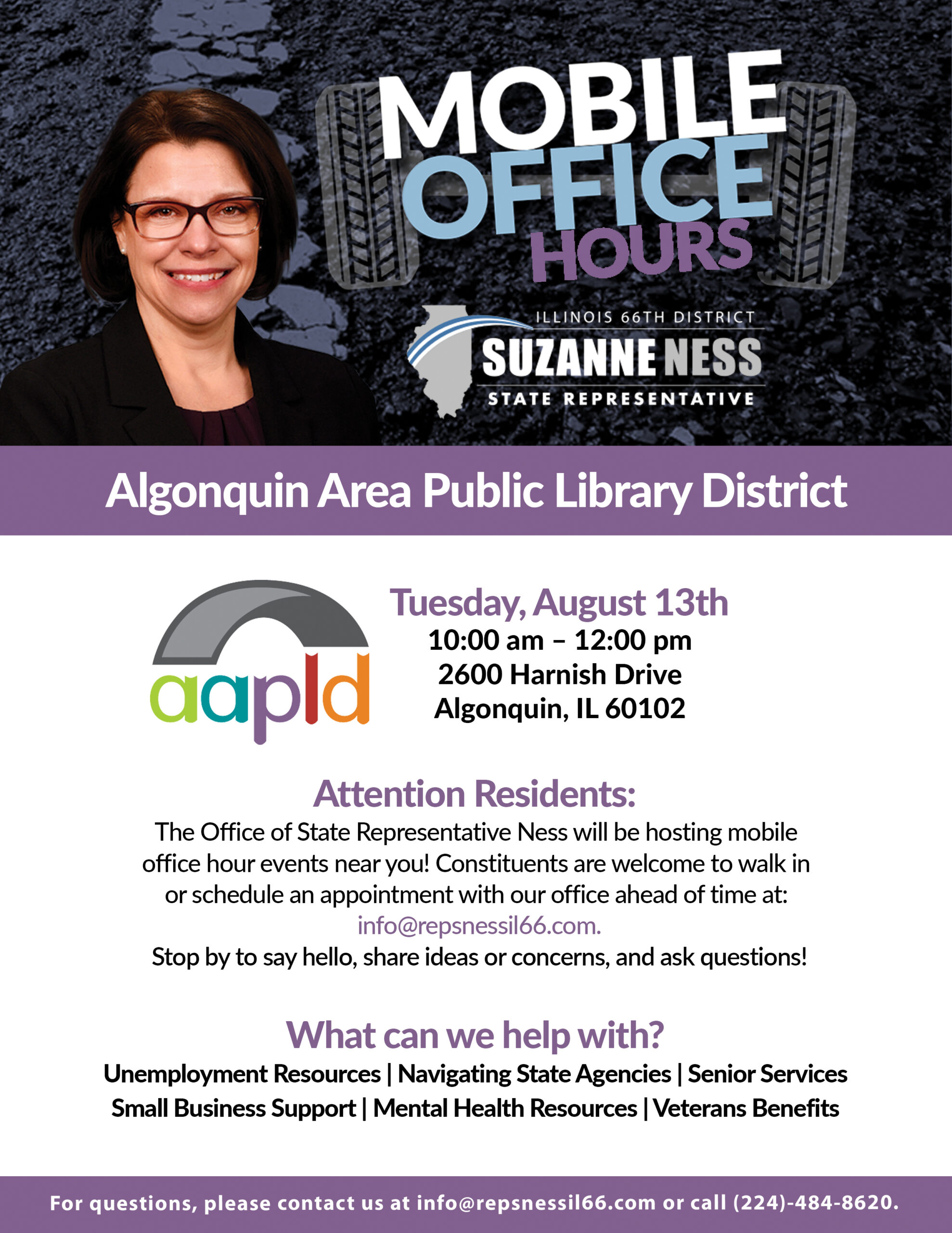 Stop by the Algonquin Area Public Library District on April 6th from 10:00 AM to 12:00 PM to connect with Representative Suzanne Ness and receive the personalized assistance you deserve — no appointment required.